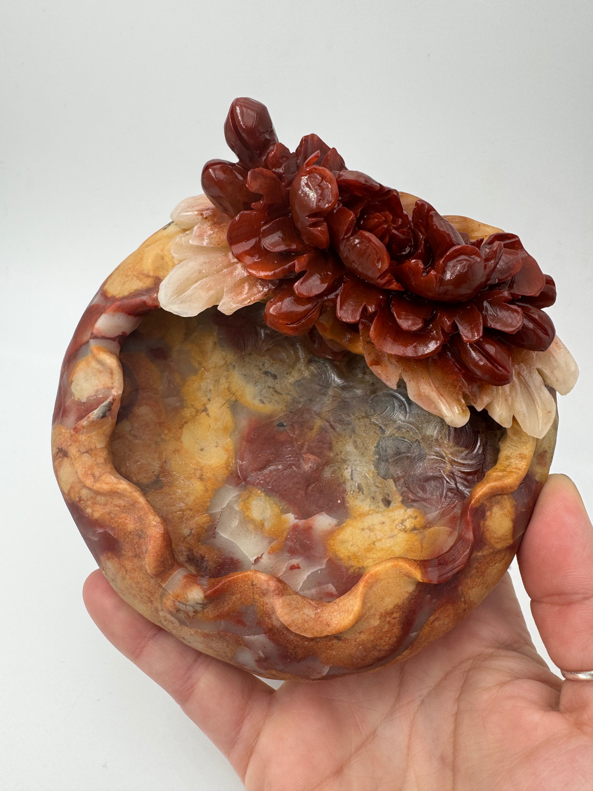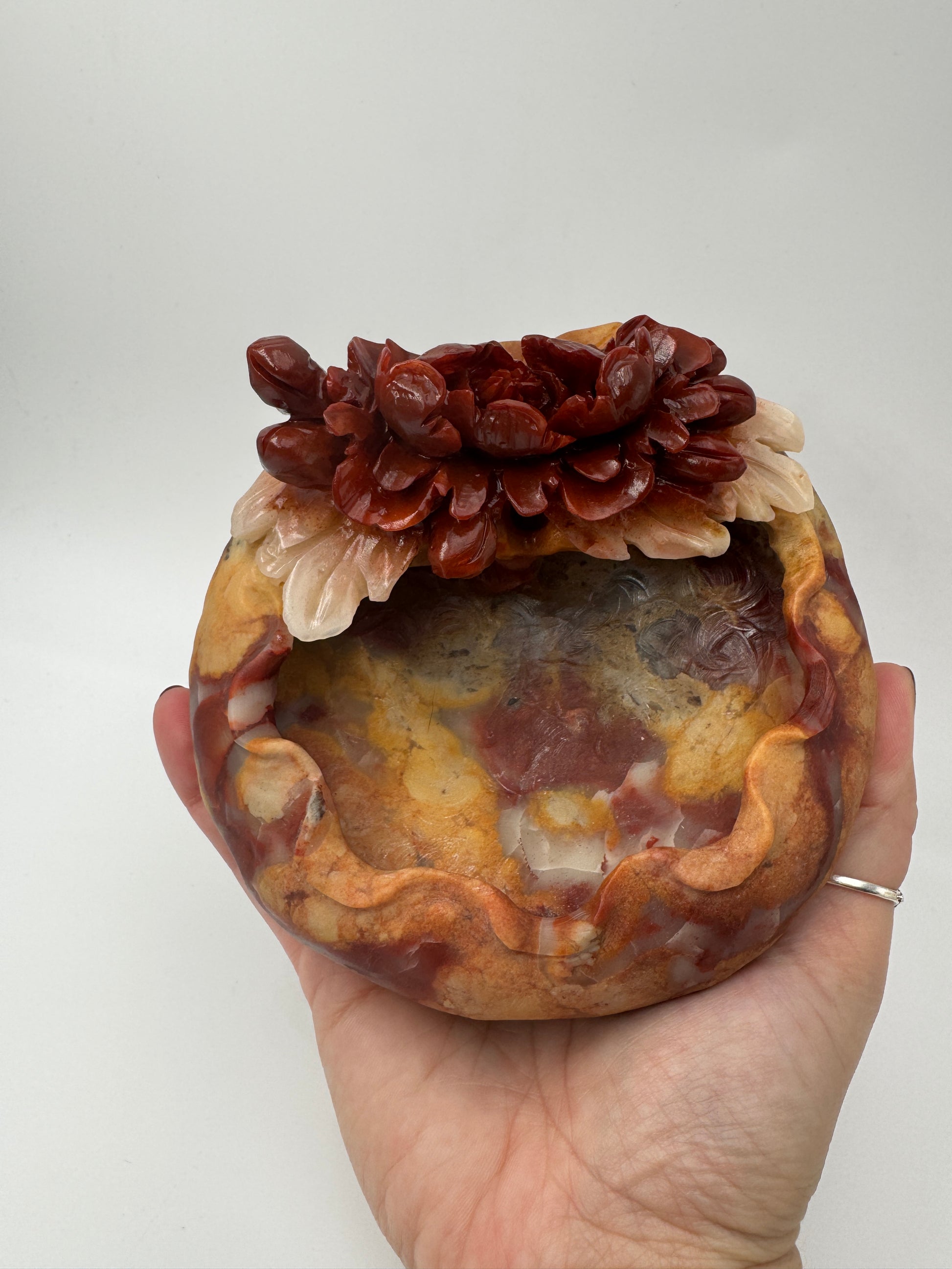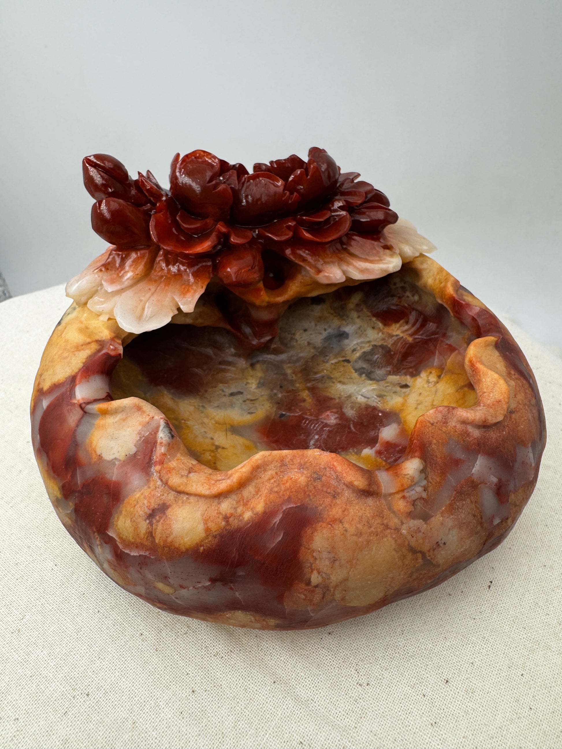 Die Schale wurde aus mexikanischem Achat gearbeitet. Nur die Blumen sind poliert. Der Rest der Schale ist naturbelassen.