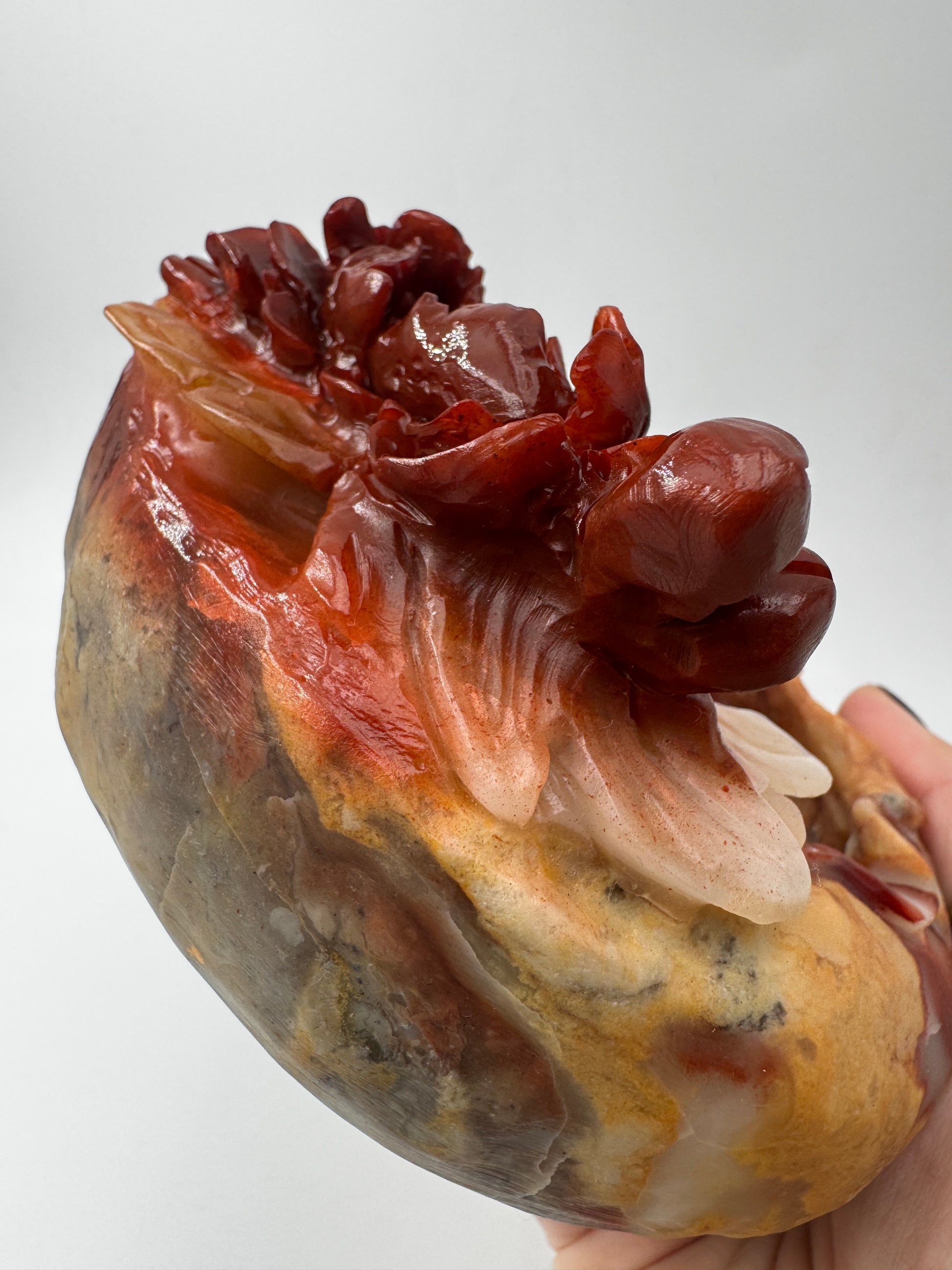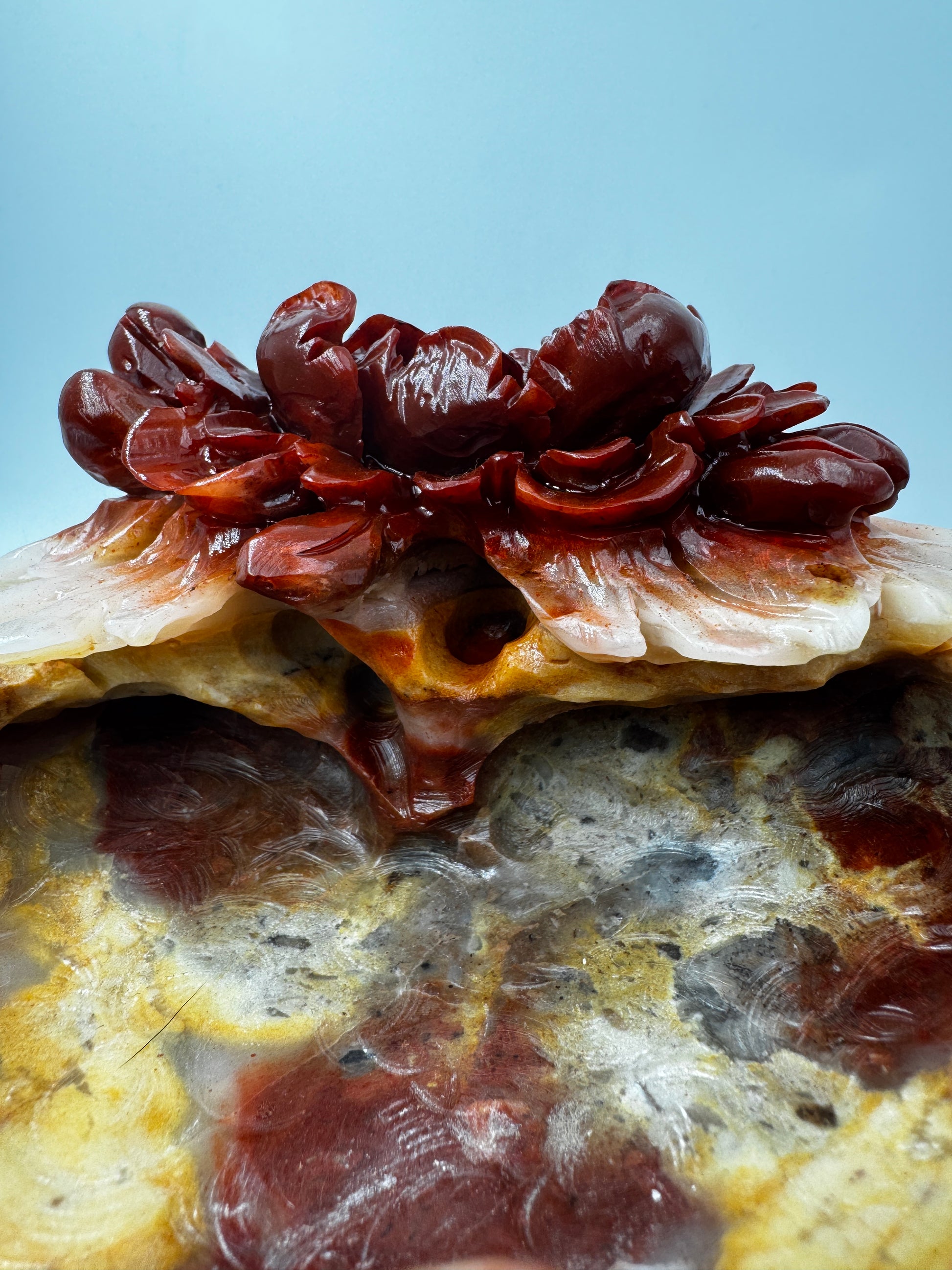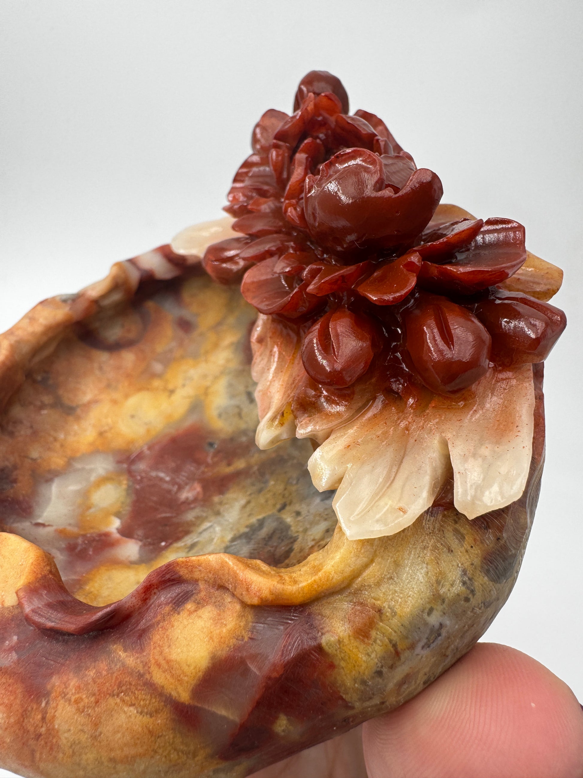 Die Schale wurde aus mexikanischem Achat gearbeitet. Nur die Blumen sind poliert. Der Rest der Schale ist naturbelassen.